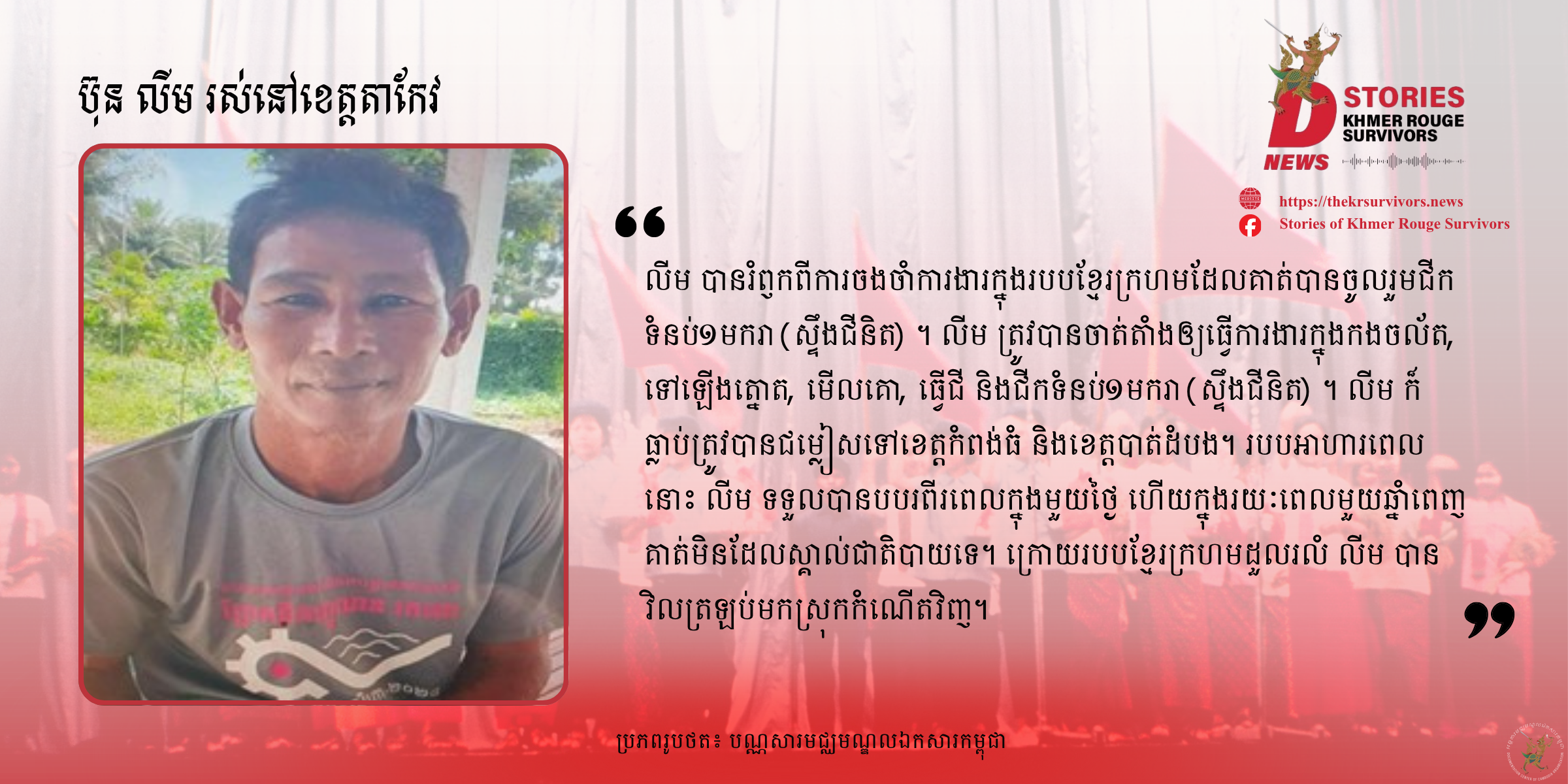 នៅក្នុងរបបខ្មែរក្រហម អ្វីដែលខ្ញុំមិនអាចបំភ្លេចបាននោះ គឺខ្មែរក្រហមចាត់តាំងឱ្យខ្ញុំទៅធ្វើការក្នុងកងចល័ត។ ខ្ញុំបានទៅឡើងត្នោត មើលគោ និងធ្វើជីដាក់ស្រែ។ ខ្មែរក្រហមបានជម្លៀសឱ្យខ្ញុំទៅរស់នៅភូមិព្រៃស្រង៉ែ ឃុំបល្ល័ង្គ ស្រុកបារាយណ៍ ខេត្តកំពង់ធំ។ ខ្មែរក្រហមបានបញ្ជូនឱ្យខ្ញុំទៅធ្វើការក្នុងកងចល័តដដែល។ ខ្ញុំបានទៅជីកទំនប់១មករា (ស្ទឹងជីនិត)។ ខ្ញុំធ្វើការងារបានប្រហែល១០ថ្ងៃ ខ្មែរក្រហមបានដកចេញពីកង ហើយបញ្ជូនអ្នកថ្មីមកដាក់ជំនួសវិញ។ ខ្មែរក្រហមបានចាត់តាំងឱ្យខ្ញុំទៅឡើងត្នោត។ ខ្មែរក្រហមចង់ពិសោធន៍ថា ខ្ញុំអាចតស៊ូទ្រាំនឹងការងារនេះបានដែរឬទេ? ការងារនេះ ខ្ញុំធ្វើបានប្រហែល៥ថ្ងៃ ខ្មែរក្រហមបានដកឱ្យខ្ញុំទៅមើលគោវិញ។ ដោយកំណត់ឱ្យធ្វើការចាប់ពីម៉ោង៩ព្រឹក រហូតដល់ម៉ោង៥ល្ងាច។ មួយក្រុមខ្ញុំមានគ្នា១០នាក់។ ខ្មែរក្រហមបានចែកអង្ករឱ្យមួយថ្ងៃ៣កំប៉ុង។ រយៈពេលមួយឆ្នាំពេញខ្ញុំមិនដែលស្គាល់ជាតិបាយទេ។ ពេលនោះខ្មែរក្រហមបានចាត់តាំងឱ្យខ្ញុំមើលការខុសត្រូវមនុស្ស៥០នាក់។ ប្រជាជនទាំងអស់ធ្វើការងារបានល្អណាស់ មិនហ៊ានត្អូញត្អែរអ្វីឡើយ។ សូម្បីតែខ្ញុំផ្ទាល់ជាប្រធាន នៅតែធ្វើការដូចប្រជាជនទូទៅដែរ។ ក្រោយមកខ្មែរក្រហមបានជម្លៀសឱ្យខ្ញុំមករស់នៅស្រុកសំពៅលូន ខេត្តបាត់ដំបង។ ខ្មែរក្រហមប្រើឱ្យខ្ញុំទៅជីកទំនប់ និងលើកប្រឡាយដដែល។ ខ្មែរក្រហមកំណត់ឱ្យធ្វើចាប់ពីម៉ោង៧ព្រឹក ដល់ម៉ោង១១កន្លះ។ ពេលរសៀលពីម៉ោង១ ដល់ម៉ោង៨ល្ងាច ទើបឲ្យឈប់សម្រាក។ របបអាហារទទួលបានបបរពីរពេលក្នុងមួយថ្ងៃ។ សម្លៀកបំពាក់ក្នុងរបបខ្មែរក្រហម មានតែខោអាវមួយកំប្លេ ពណ៌ខ្មៅៗ និងស្បែកជើងកង់ឡានមួយសម្រាប់ប៉ុណ្ណោះ។ នៅក្នុងរបបខ្មែរក្រហមគ្មានកម្មសិទ្ធិឯកជនឡើយ។ កាលនោះ ឪពុកខ្ញុំមានកង់មួយ ត្រូវខ្មែរក្រហមប្រមូលយកទៅដាក់រួម។ គោមួយនឹមដូរបានត្រឹមតែចានពីរប៉ុណ្ណោះ។ ប្រជាជនដែលត្រូវខ្មែរក្រហមធ្វើបាបភាគច្រើន គឺប្រជាជនជម្លៀសមកពីភូមិភាគបូព៌ា។ ខ្មែរក្រហមសម្លាប់ប្រជាជនទាំងដែលគ្មានកំហុស ដោយប្រើពាក្យថា «បញ្ជូនទៅកសាង» តាមពិត គឺយកទៅសម្លាប់ចោល។