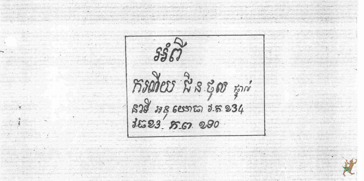 [1] ឯកសារ J00៤៥០ តម្កល់នៅមជ្ឈមណ្ឌលឯកសារកម្ពុជា, ចម្លើយសារភាពរបស់ ជិន ថុល នាទីជាអនុយោធាវរសេនាតូច២៣៤, ភូមិភាគបូព៌ា, ចំនួន២០។
