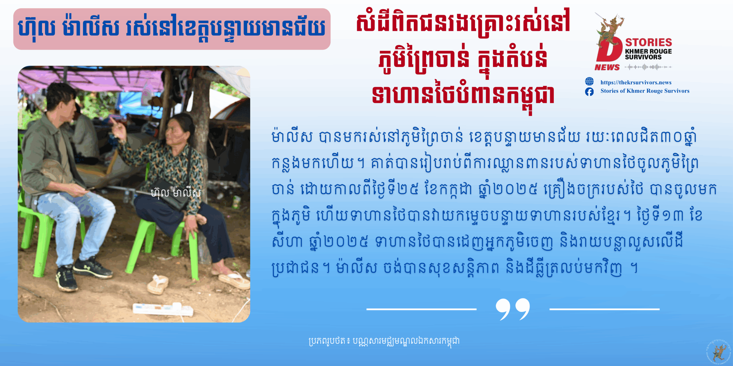 ១ ឡុង ដានី សម្ភាសន៍ជាមួយ ហ៊ុល ម៉ាលីស ដែលរស់នៅភូមិព្រៃចាន់ ឃុំអូរបីជាន់ ស្រុកអូរជ្រៅ ខេត្តបន្ទាយមានជ័យ នៅថ្ងៃទី២៧ ខែកក្កដា ឆ្នាំ២០២៥