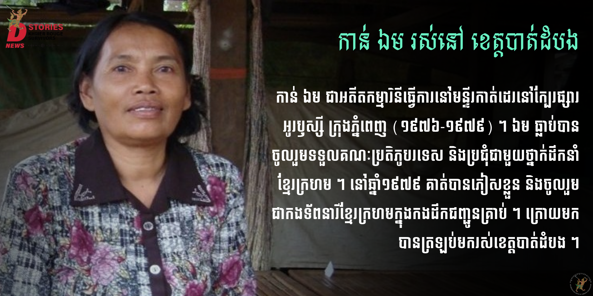 ខ្ញុំឈ្មោះ កាន់ ឯម ភេទស្រី[1] អាយុ៦៦ឆ្នាំ។ ខ្ញុំ មានស្រុកកំណើតនៅក្នុងភូមិជង្ហុក ឃុំសំបូរមាស(បច្ចុប្បន្នស្ថិតក្នុងឃុំអំពិល) ស្រុកកំពង់សៀម ខេត្តកំពង់ចាម។ សព្វថ្ងៃ ខ្ញុំ រស់នៅក្នុងភូមិពេជ្រចិន្តា ឃុំពេជ្រចិន្តា ស្រុកភ្នំព្រឹក ខេត្តបាត់ដំបង។ ឪពុកឈ្មោះ កាន់ ម៉េត (ស្លាប់) និងម្ដាយឈ្មោះ រស់ ស៊ីម (ស្លាប់)។ ខ្ញុំ មានបងប្អូនបង្កើតចំនួន៥នាក់ នៅរស់រានមានជីវិតចំនួន៤នាក់។ ស្វាមីរបស់ ខ្ញុំ ឈ្មោះ ឈឹម អៀម អាយុ៧២ឆ្នាំ និងមានកូនចំនួន២នាក់(ស្រីម្នាក់)។