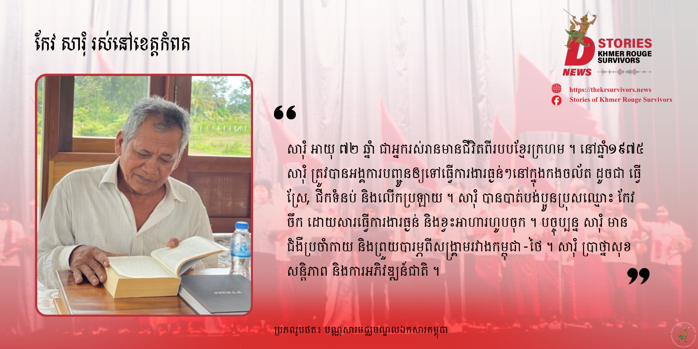 [1] កែវ សារុំ ៖សម្ភាសន៍ផ្ទាល់មាត់«សាច់រឿងសង្ខេបអ្នករស់រានមានជីវិតពីរបបខ្មែរក្រហម និងស្ថានភាពសុខភាពបច្ចុប្បន្ន»សម្ភាសន៍ដោយ៖ ផាត ពន្លក នៅ ខែតុលា ឆ្នាំ២០២៥, មជ្ឈមណ្ឌលសះស្បើយសហគមន៍បាក់នឹម មជ្ឈមណ្ឌលឯកសារកម្ពុជា សាខាខេត្តកំពត