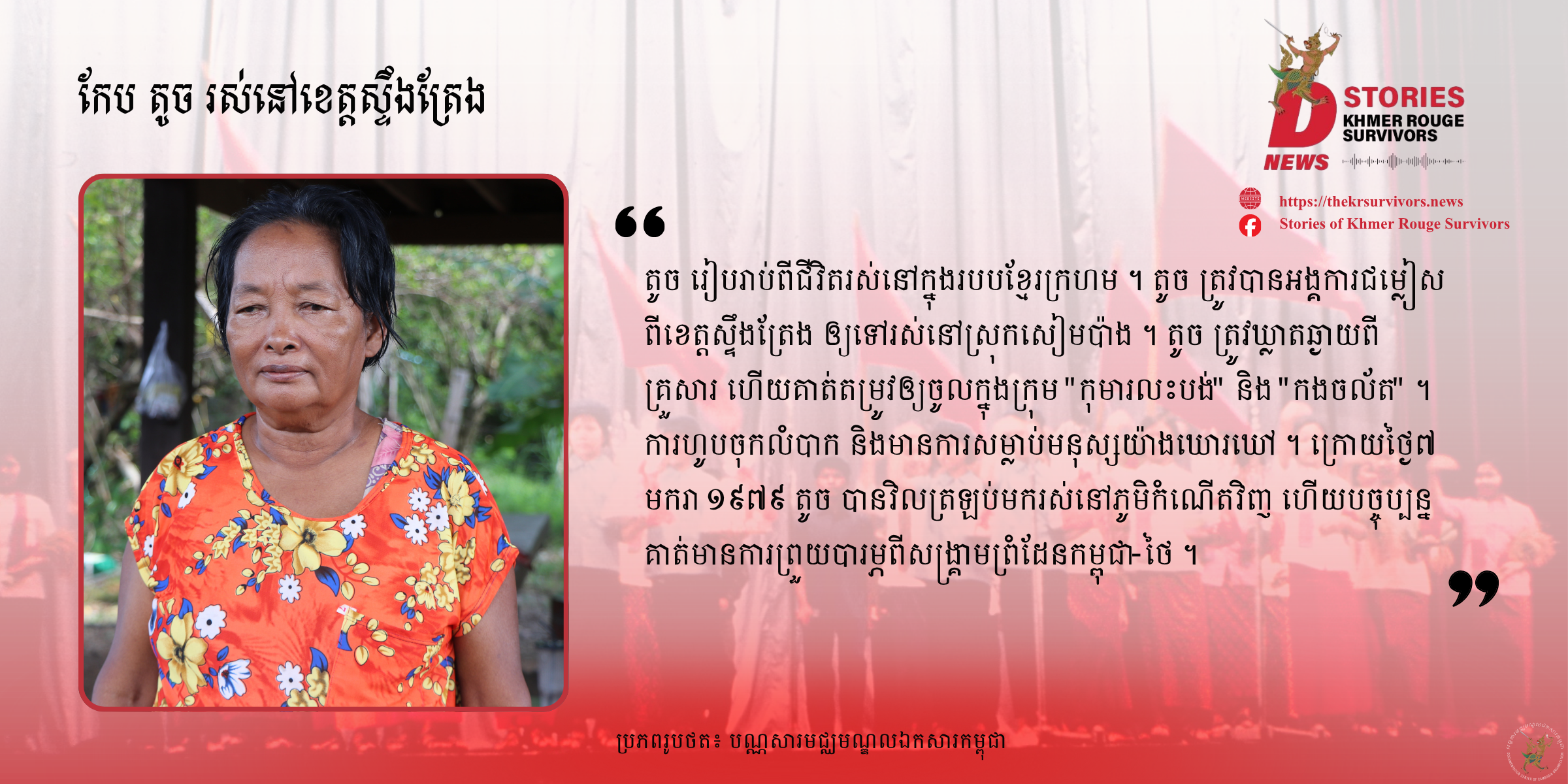 [1] បទសម្ភាសន៍ «ប្រវត្តិសាស្រ្តផ្ទាល់មាត់៖ បទពិសោធន៍អ្នករស់រានមានជីវិតពីរបបខ្មែរក្រហម» ជាមួយ កែប តូច អ្នករស់រានមានជីវិតពីរបបខ្មែរក្រហមនៅស្រុកបុរីអូរស្វាយ-សែនជ័យ ខេត្តស្ទឹងត្រែង ឆ្នាំ២០២៥, សម្ភាសដោយ ស្រេង លីដា បណ្ណសារមជ្ឈមណ្ឌលឯកសារកម្ពុជា។