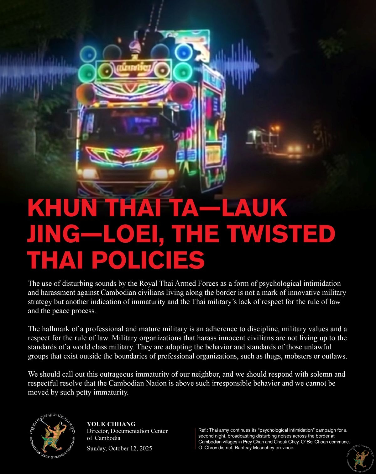 The use of disturbing sounds by the Royal Thai Armed Forces as a form of psychological intimidation and harassment against Cambodian civilians living along the border is not a mark of innovative military strategy but another indication of immaturity and the Thai military’s lack of respect for the rule of law and the peace process.