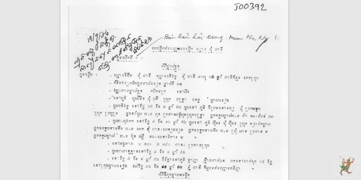 ចម្លើយសារភាពទទួលបានពីការសួរចម្លើយរយៈពេល៩ម៉ោង ដកស្រង់ខ្លឹមសារពីឯកសារចម្លើយសារភាព J00392 តម្កល់នៅមជ្ឈមណ្ឌលឯកសារកម្ពុជា