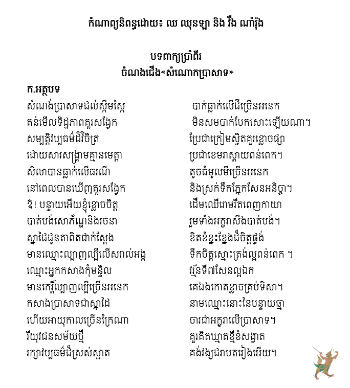 កំណាព្យបទពាក្យប្រាំពីរ «សំណោកប្រាសាទ» 1 year ago អត្ថបទទាក់ទងខាំ ស៊ូខៃ អ្នកស្ម័គ្រចិត្តកម្ពុជា ខេត្តរតនគិរីម៉ាត់ ណាសៀត អ្នកស្ម័គ្រចិត្តកម្ពុជាខេត្តត្បូងឃ្មុំអ្នកស្ម័គ្រចិត្តកម្ពុជាខេត្តរតនគីរីអ្នកស្ម័គ្រចិត្តកម្ពុជាខេត្តស្វាយរៀងគ្រួសារមជ្ឈមណ្ឌលឯកសារកម្ពុជាកាន់បិណ្ឌទី១៣ នៅវត្តបាក់នឹមអ្នកស្ម័គ្រចិត្តកម្ពុជាខេត្តកំពតចែករម្លែកទៅបណ្តាញទំនាក់ទំនងសង្គម Tags:អ្នកស្ម័គ្រចិត្តកម្ពុជា Related Posts វង្ស ស្រីឃីម អ្នកស្ម័គ្រចិត្តកម្ពុជាខេត្តក្រចេះ ស្រេង ករុណា អ្នកស្ម័គ្រចិត្តកម្ពុជាខេត្តស្ទឹងត្រែង ជួន រក្សា អ្នកស្ម័គ្រចិត្តកម្ពុជាខេត្តព្រៃវែង About The Author Eng Sokmeng Add a Comment Cancel replyYour email address will not be published. Required fields are marked *Comment Save my name, email, and website in this browser for the next time I comment.
