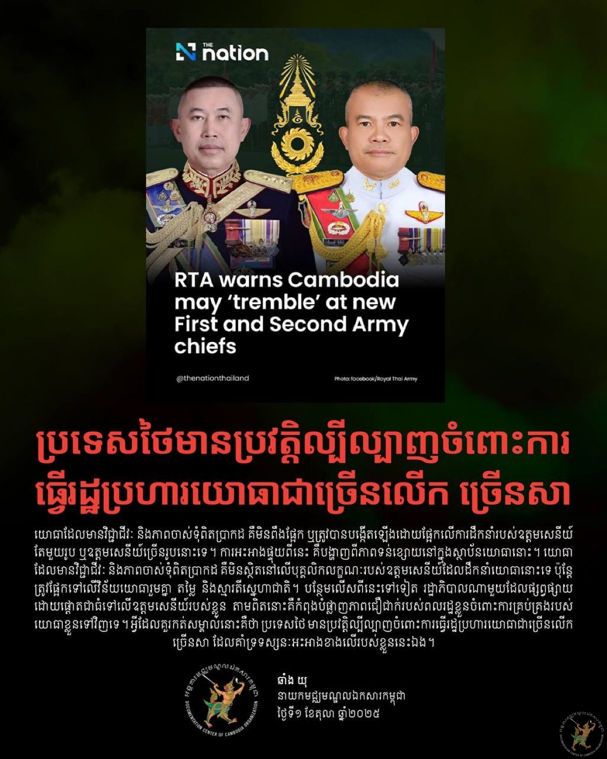 “ការផ្លាស់ប្តូរកងទ័ពភូមិន្ទថៃ៖ កម្ពុជាអាចនឹង «តក់ស្លុត» ចំពោះមេបញ្ជាការថ្មីរបស់ថៃ កងទ័ពទី១ និងកងទ័ពទី២?”