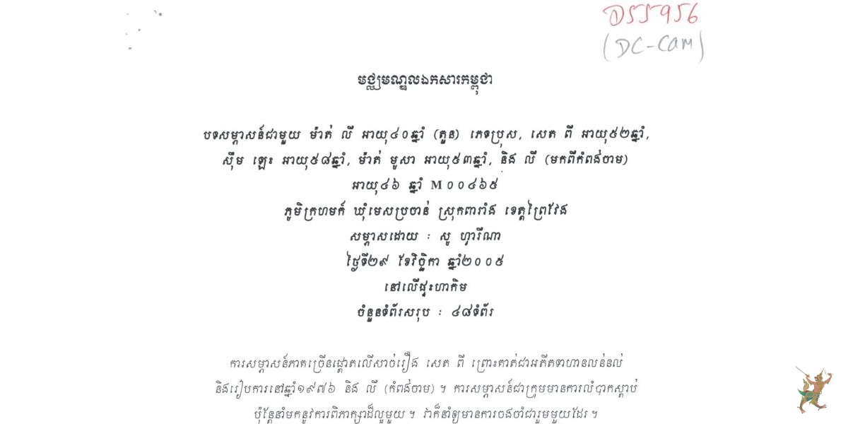 [1] ឯកសារ D៥៥៩៥៦ តម្កល់ទុកនៅមជ្ឈមណ្ឌលឯកសារកម្ពុជា។ កិច្ចសម្ភាសជាមួយ បុគ្គលចំនួន ៥រូប ឈ្មោះ សេត ពី ភេទប្រុសអាយុ៥២ឆ្នាំ, ម៉ាត់ លី ភេទប្រុសអាយុ៤០ឆ្នាំ, ស៊ីម ឡេះ អាយុ៥៨ឆ្នាំ, ម៉ាត់ មូសា អាយុ៥៣ឆ្នាំ និង លី អាយុ៤៦ឆ្នាំ។ ចំពោះសាច់រឿងដែលត្រូវយកមកសរសេរនៅក្នុងអត្ថបទនេះ គឺជាសាច់រឿងរបស់«សេត ពី ភេទប្រុស អាយុ៥២ឆ្នាំ រស់នៅភូមិក្រហមក៍ ឃុំមេសរប្រចាន់ ស្រុកពារាំង ខេត្តព្រៃវែង ថ្ងៃទី២៩ ខែវិច្ឆិកា ឆ្នាំ២០០៥», ប្រតិចារឹកចំនួន៤៨ទំព័រ។ សម្ភាសដោយ សូហ្វារីណា។