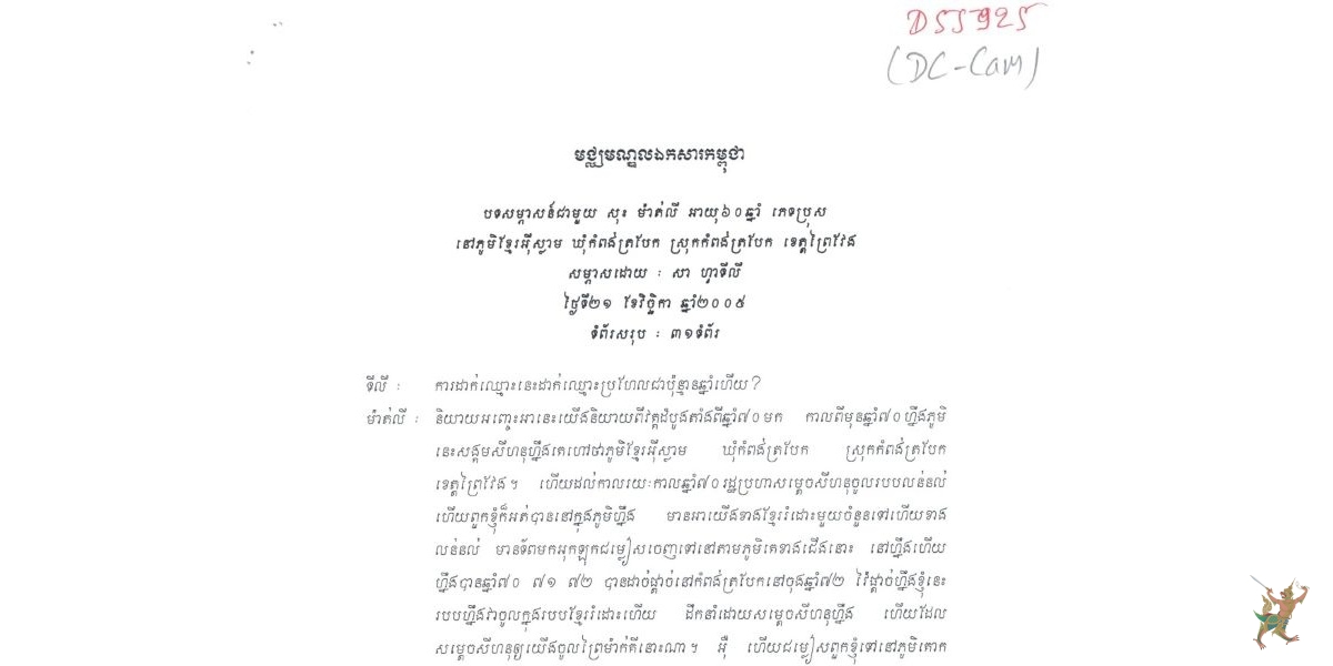 [3] ឯកសារ D៤១៣៦៥ តម្កល់ទុកនៅក្នុងមជ្ឈមណ្ឌលឯកសារកម្ពុជា មានចំណងជើង«លី យ៉ាស់ ភេទស្រី អាយុ៦០ឆ្នាំ រស់នៅភូមិកន្សោមអក ឃុំកន្សោមអក ស្រុកកំពង់ត្របែក ខេត្តព្រៃវែង ថ្ងៃទី២៨ ខែវិច្ឆិកា ឆ្នាំ២០០៥»។ សម្ភាសដោយ ហ៊ាង សុគុណ ជានិស្សិតស្ម័គ្រចិត្តមជ្ឈមណ្ឌលឯកសារកម្ពុជា។ នៅក្នុងបទសម្ភាស បាននិយាយពីការសម្លាប់មនុស្សនៅចុងឆ្នាំ១៩៧៨ ដោយពេលនោះ មានទឹកឡើងខ្លាំង ហើយសាកសពមនុស្សដែលបានសម្លាប់រួច ក៏អណ្តែតមកតាមទឹកទាំងអស់។ ភាគច្រើននៃសាកសពទាំងអស់នោះ ត្រូវបានយកទៅសម្លាប់នៅទីតាំងទួលម្រិញ ស្រុកកំពង់ត្របែក ខេត្តព្រៃវែង។