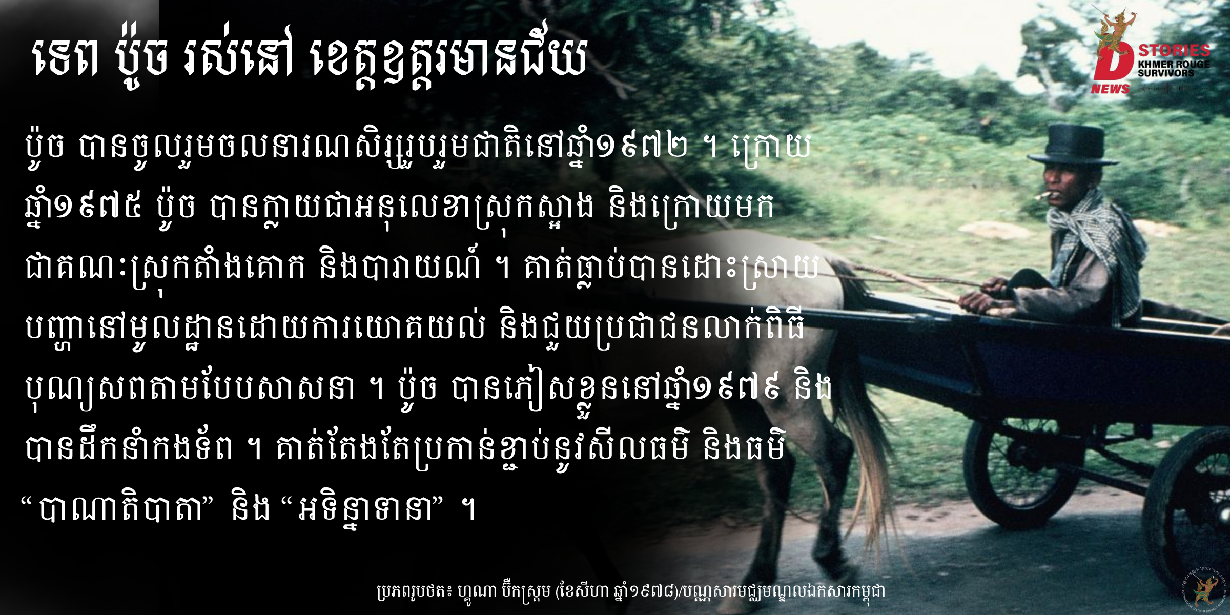 បន្ទាប់ពីការរំដោះទីក្រុងភ្នំពេញនៅក្នុងឆ្នាំ១៩៧៥ ខ្ញុំបានទទួលតួនាទីជាអនុលេខាស្រុកស្អាង។ ខ្ញុំបានប្រាប់សមាជិកទាំងអស់ថា ខ្ញុំពិនិត្យតាមដានសកម្មភាពទាំងឡាយ ដែលប្រឆាំងនឹងបក្សតែប៉ុណ្ណោះ។ ខ្ញុំមិនកំណត់មុខសញ្ញាឈ្មោះអ្នកនេះ ឬអ្នកនោះ ឬរាយការណ៍អំពីនរណាម្នាក់ឡើយ។ ខ្ញុំមិនអាចធ្វើដូច្នេះបានឡើយ ដោយសារខ្ញុំមិនមែនជាអ្នកស្រុកនៅទីនោះ។ ខ្ញុំ និងឪពុកម្តាយខ្ញុំសុទ្ធសឹងជាអ្នកប្រកាន់ខ្ជាប់ព្រះពុទ្ធសាសនានៅក្នុងចិត្តដែរ។