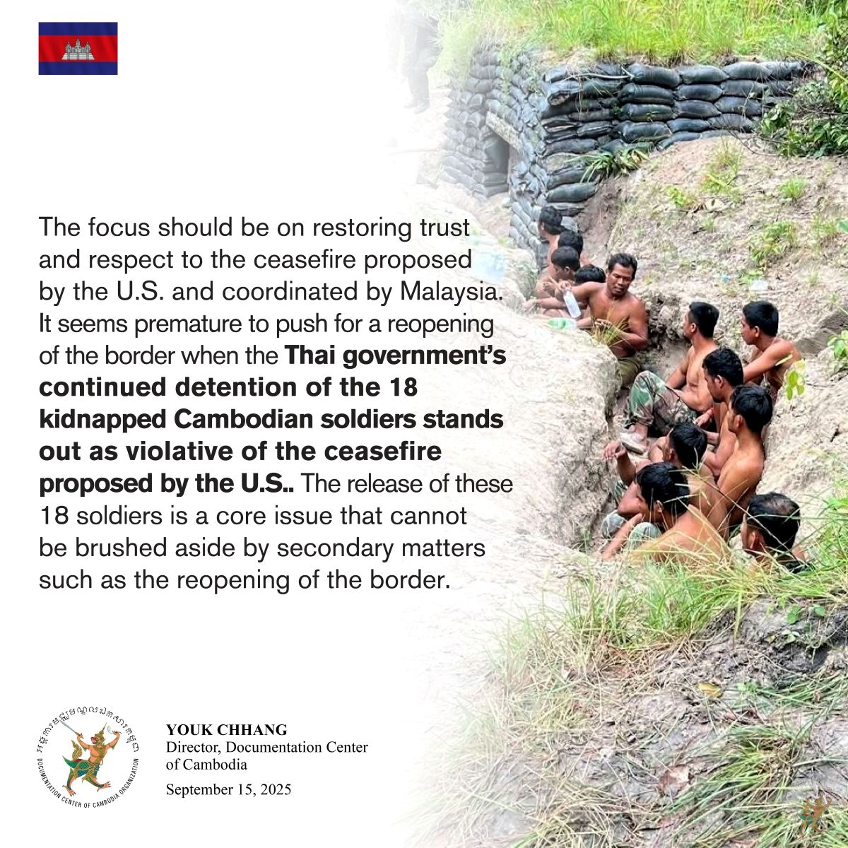 The focus should be on restoring trust and respect to the ceasefire proposed by the U.S. and coordinated by Malaysia. It seems premature to push for a reopening of the border when the Thai government’s continued detention of the 18 kidnapped Cambodian soldiers stands out as violative of the ceasefire proposed by the U.S. The release of these 18 soldiers is a core issue that cannot be brushed aside by secondary matters such as the reopening of the border.