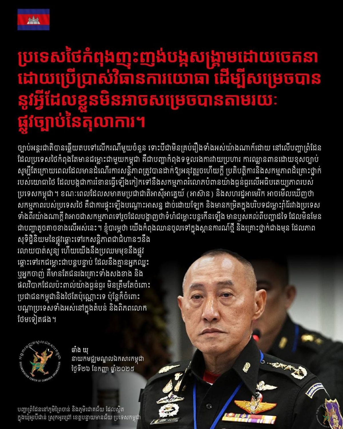 ប្រទេសថៃកំពុងញុះញង់បង្កសង្គ្រាមដោយចេតនា ដោយប្រើប្រាស់វិធានការយោធា ដើម្បីសម្រេចបាននូវអ្វីដែលខ្លួនមិនអាចសម្រេចបានតាមរយៈផ្លូវច្បាប់នៃតុលាការ