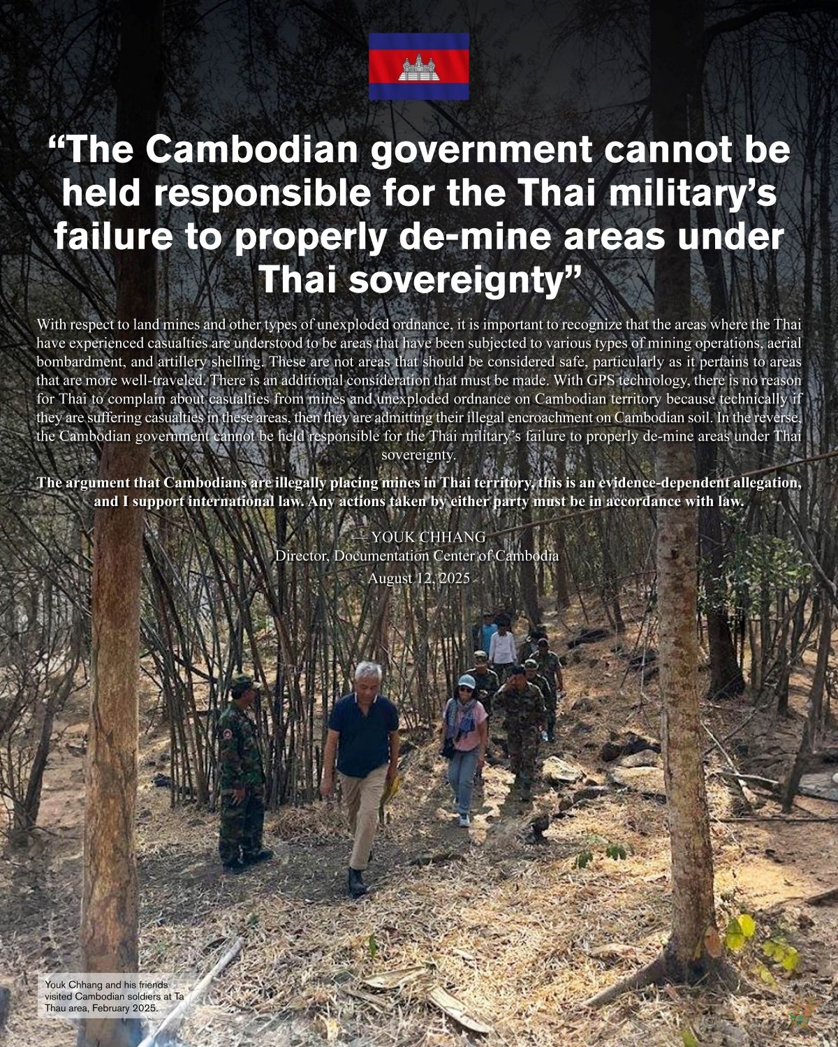 With respect to land mines and other types of unexploded ordnance, it is important to recognize that the areas where the Thai have experienced casualties are understood to be areas that have been subjected to various types of mining operations, aerial bombardment, and artillery shelling. These are not areas that should be considered safe, particularly as it pertains to areas that are more well-traveled. There is an additional consideration that must be made. With GPS technology, there is no reason for Thai to complain about casualties from mines and unexploded ordnance on Cambodian territory because technically if they are suffering casualties in these areas, then they are admitting their illegal encroachment on Cambodian soil. In the reverse, the Cambodian government cannot be held responsible for the Thai military’s failure to properly de-mine areas under Thai sovereignty.