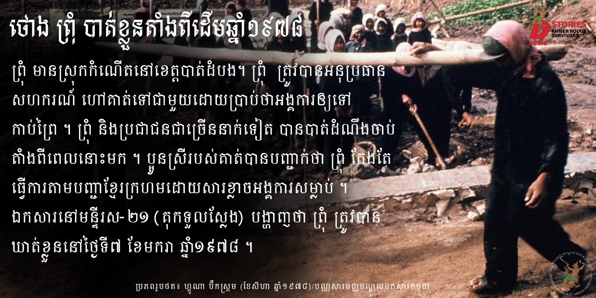 [2] ឯកសារលេខ K០៨១០០. (១៩៧៨). ប្រវត្តិរូបអ្នកទោសជាប់ឃុំឃាំង ឈ្មោះ ថោង ព្រុំ. មជ្ឈមណ្ឌលឯកសារកម្ពុជា.